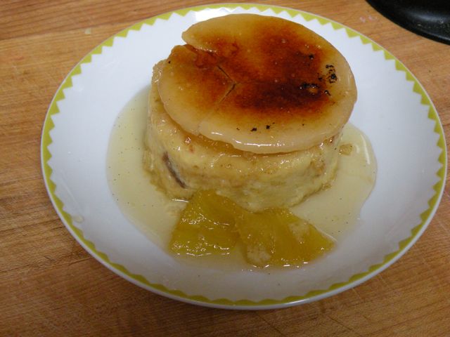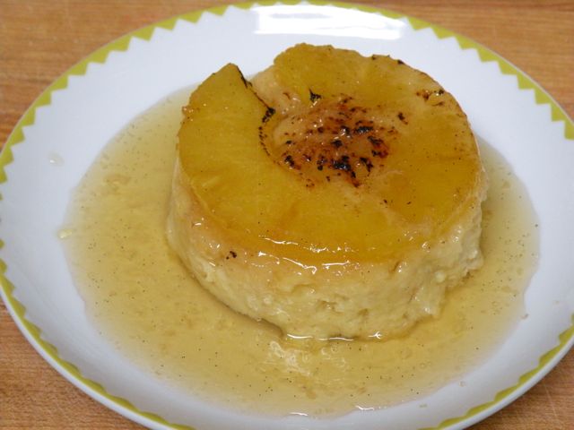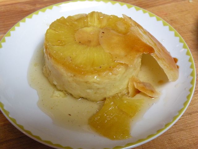 I baked the cakes for about 35 minutes, when the internal temperature was 160 degrees. I let them cool about 5 minutes and then unmolded them onto a plate. The caramel was still hard and was just a disk that was stuck in the bottom of the ramekin. My caramel must not have been dark enough because it looked anemic when I removed it and put it on top of the pineapple cake. I was trying to figure out whether to just throw it out altogether when I decided that I could take the torch to the caramel to brown it up a bit. So that is what we did and tried it with the disk on the top of the pineapple as well as to the side. Still, the caramel itself really didn’t taste that great and was rock hard. After eating our little cakes and quite liking the taste of them without the caramel, we had an idea. Why not forget the caramel altogether and just put a little turbino sugar on top of the pineapple and caramelize the sugar. So that is what we did and I think out of the three options, the last one is the best.